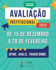 A Comissão Própria de Avaliação (CPA) da Universidade Estadual da Paraíba (UEPB) estará no período de 15 de dezembro de 2025 a 28 de fevereiro de 2026, executando uma nova etapa da avaliação e diagnóstico institucional. A avaliação institucional é instituída pelo Sistema Nacional de Avaliação da Educação Superior (SINAES), de acordo com o que prevê a Lei Federal 10.861/2004. Serão examinadas várias dimensões das atividades acadêmicas e administrativas que foram desenvolvidas no ano de 2025 na UEPB, objetivando ampliar os canais de comunicação e interação com os(as) professores(as), técnicos(as) administrativos(as) e estudantes do ensino superior presencial e a distância.